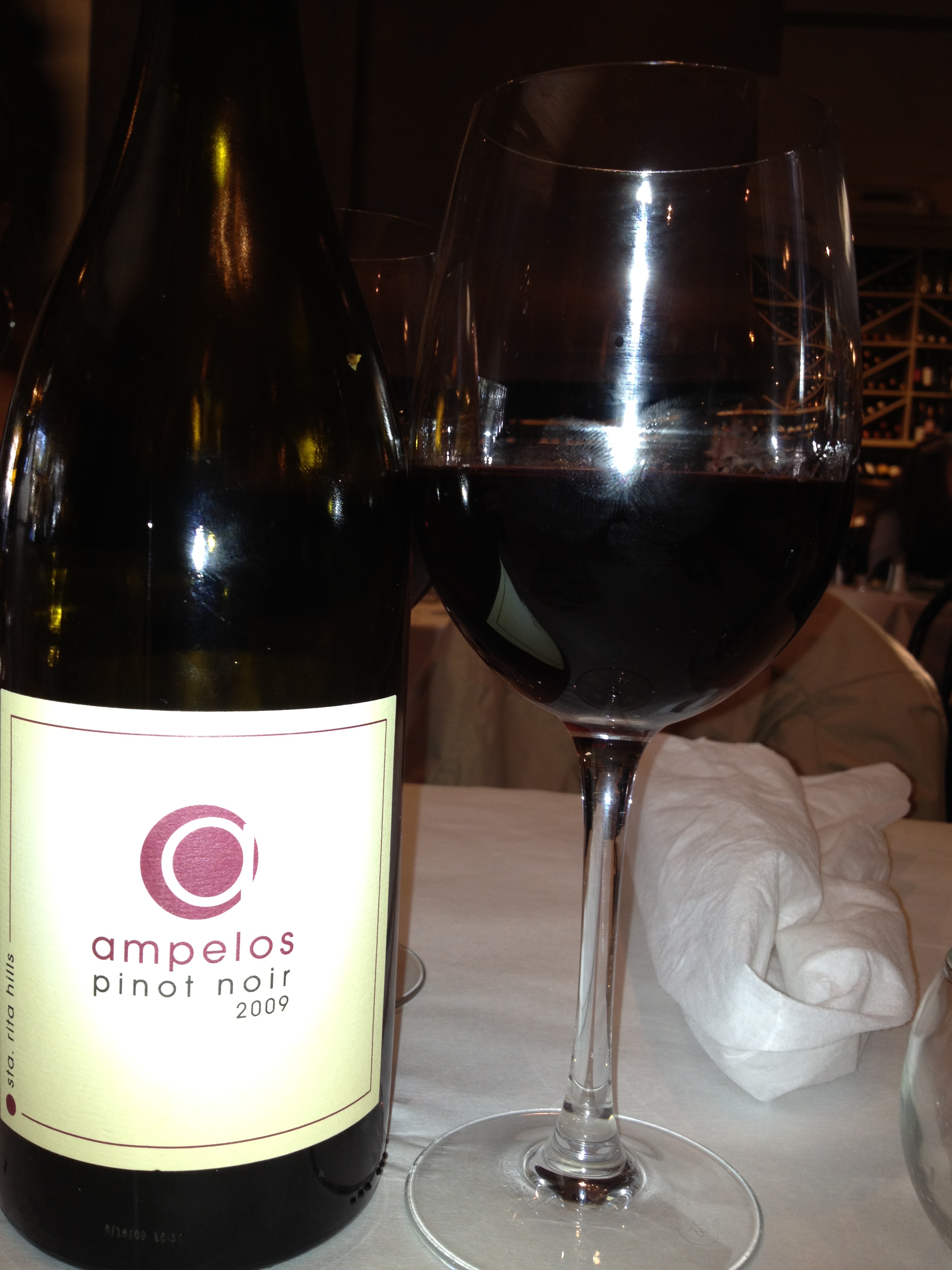 in Los Olivos, which was recently recognized by some sommelier publication for having one of the best restaurant wine lists in the country. This is the place in Sideways where Miles is deadset against having any f**kin’ Merlot. Well, we sided with Miles in ordering a Pinot Noir to share with our meal. I picked a Melville off the list, knowing that Melville makes some of the best Pinots in the county but wasn’t going to fit into our itinerary….when our server informed us that they were completely out of the Melville, they offered us a Pinot by Ampelos (also of the Santa Rita Hills AVA) at their retail store price, without the usual restaurant markup and corkage. I believe we all loved this wine, which had a beautiful garnet color and a lot of cherries on the nose. A noble exemplification of what
